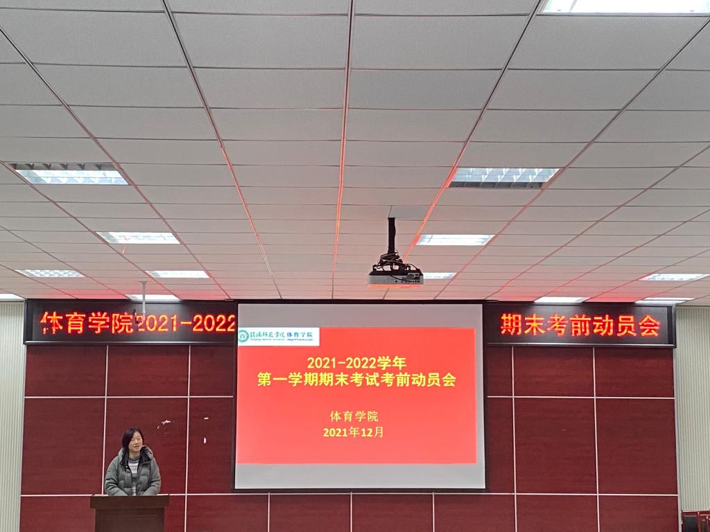 为推动学生积极备考、诚信考试,加强学生考风考纪教育,规范考试秩序,12月13日晚,体育学院2020级在体育馆多媒体教室召开2021—2022学年第一学期期末考试考前动员会。体育学院副院长张娟、2020级辅导员龙慧杰及2020级全体学生参加了本次会议。