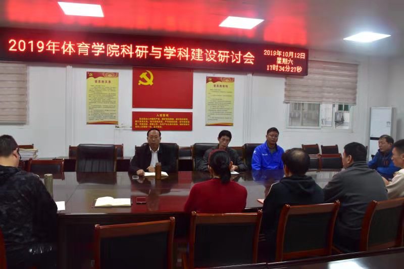 2019年10月12日下午5点,体育学院科研与学科建设研讨会在三楼会议室如期召开,体育学院党委书记陈青、院长余道明、副院长牛林杰以及部分教师参加了会议。