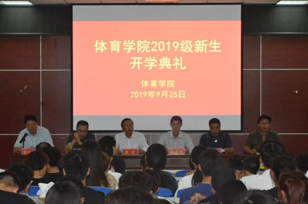 2019年9月25日下午三点我院于体育馆多媒体教室举行19级新生开学典礼,参加本次典礼的有体育学院党委书记陈青,院长余道明,副院长郭建、梁超勋、牛林杰,副处级辅导员柴九昌,体育学院各科任课老师、17级辅导员赵倩倩、程俊辉、赖梦玥,以及19级全体新生。会议由柴九昌主持。