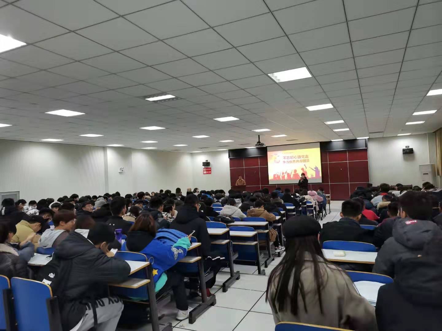 2019年11月26号下午四点半我院于体育馆多媒体教室举行“不忘初心跟党走,做合格共青团员”主题团课,本次团课的主讲人为赵倩倩老师,19级辅导员赖梦玥老师及2019级新生参会。