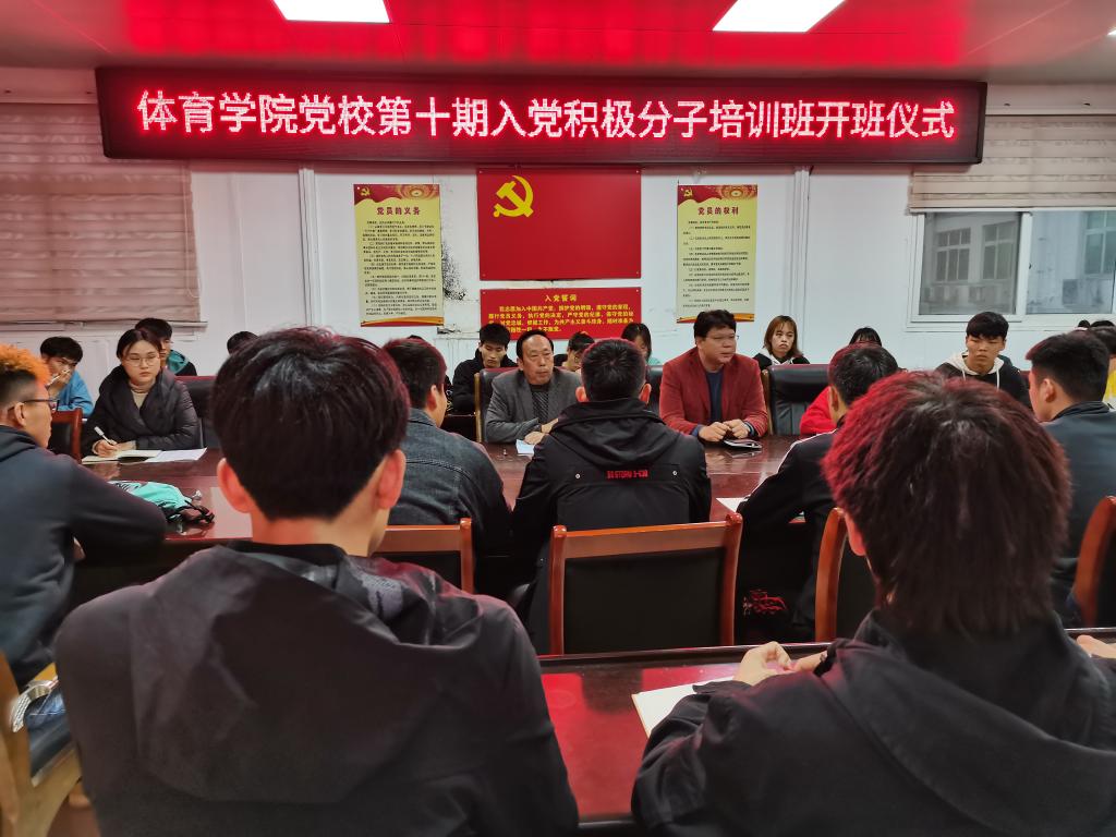 4月1日晚,体育学院第十期入党积极分子培训班在体育学院三楼会议室举行。体育学院党委书记陈青、副处级辅导员柴九昌、社体系副主任吴志远、学生党支部书记赖梦玥、龙慧杰、第10期党员入党积极分子培训班班主任程俊辉与60余名入党积极分子参加了开班典礼。开班典礼由柴九昌主持。