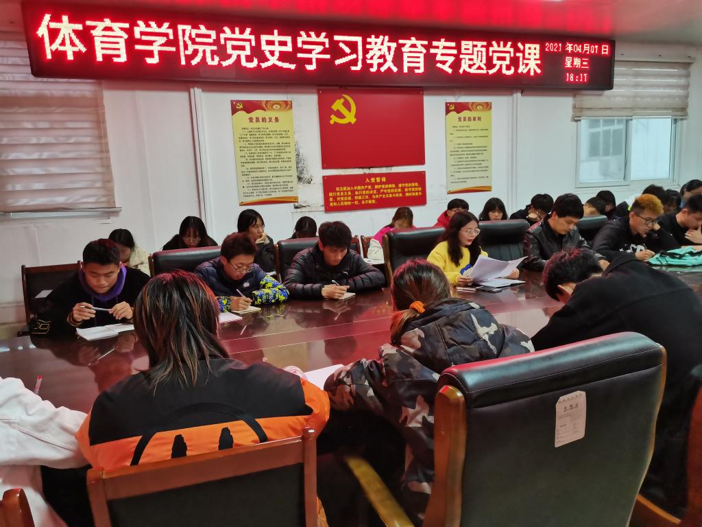 4月7日晚体育学院第十期入党积极分子培训班在体育学院三楼会议室举行,学生第二党支部书记赖梦玥为我院第十期入党积极分子讲“传承红色基因,弘扬大别山精神”党史学习教育主题党课,第10期党员入党积极份子培训班班主任程俊辉与60余名入党积极分子参加。