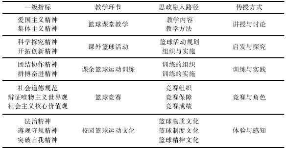 从篮球运动课程思政的理论基础中,可以凝练出爱国主义精神、集体主义精神、科学探究精神、开拓创新精神、团结协作精神、拼搏奋进精神、社会道德规范、法治精神、遵规守规精神、突破自我精神、辩证唯物主义世界观、社会主义核心价值观等 12 个一级思政教育元素指标。体育教师应深入浅出,采用契合式、植入式、点睛式、案例式等不同的融合教学方式,将思政元素融入到篮球课堂教学、课外篮球活动、课余篮球训练、篮球竞赛、校园篮球运动文化建设等教学环节,实现篮球运动课程思政教育的全覆盖。体育教师应采用讲授与讨论、启发与探究、训练与实践、竞赛与角色、体验与感知等方法,在高校篮球运动的教学内容、教学方法、活动规划、训练的组织与实施、竞赛的组织与保障、竞赛成绩、篮球精神文化建设等教学细节上融入思政元素,构建高校篮球运动课程的思政教育体系。